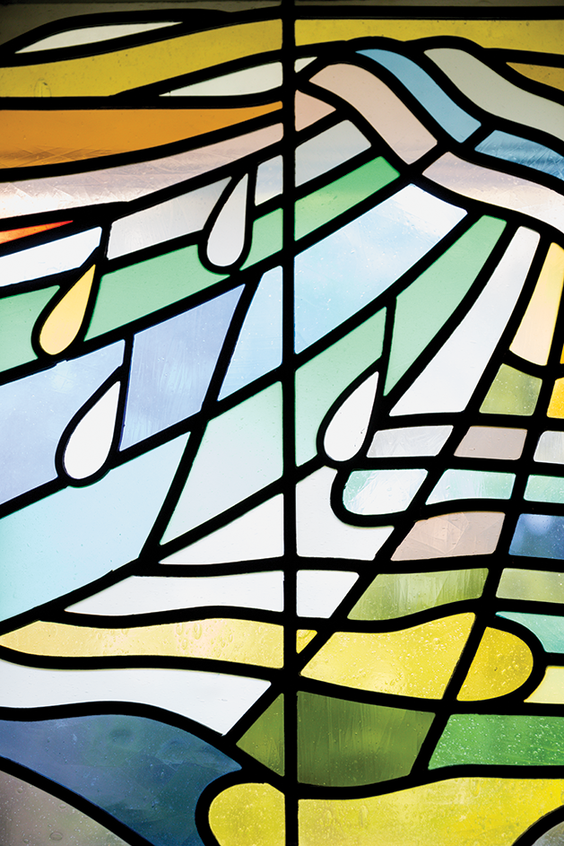 He sighs and pauses. “You know, I look at faith, particularly the Christian faith, I look at it from an artist’s point of view. The important thing is how I can convey, as an artist, the scene people want in their church to inspire them. It’s outwardly directed. I listen to them, find out what is important to them and then I interpret that,” he says. And he’s done it hundreds of times, in 370 stained glass commissions for places of worship, hospitals, universities and private residences.