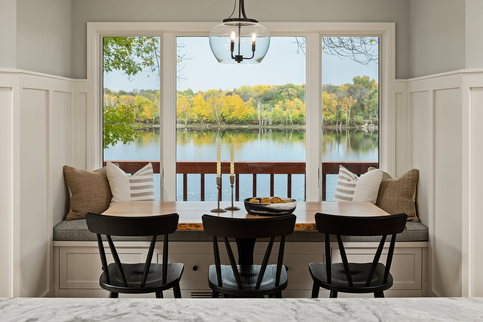 Wainscoting in the dining room and breakfast nook tie in with the kitchen millwork and help define the spaces. The nook has a live-edge table and a built-in bench with storage. “The views are big throughout the house, but the nook feels cozy,” Poissant says. “You can enjoy the lake and be connected to what’s happening in the kitchen.”