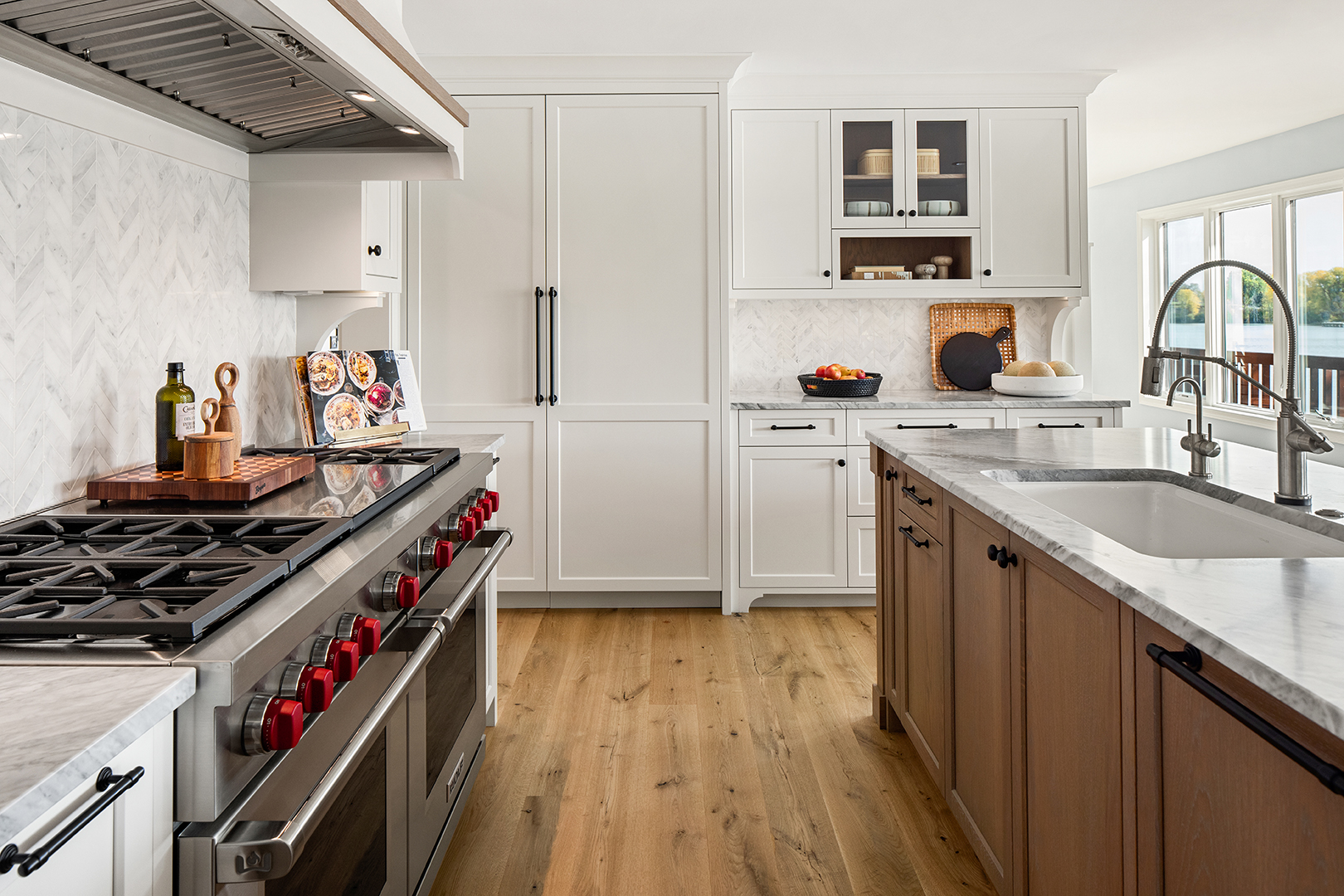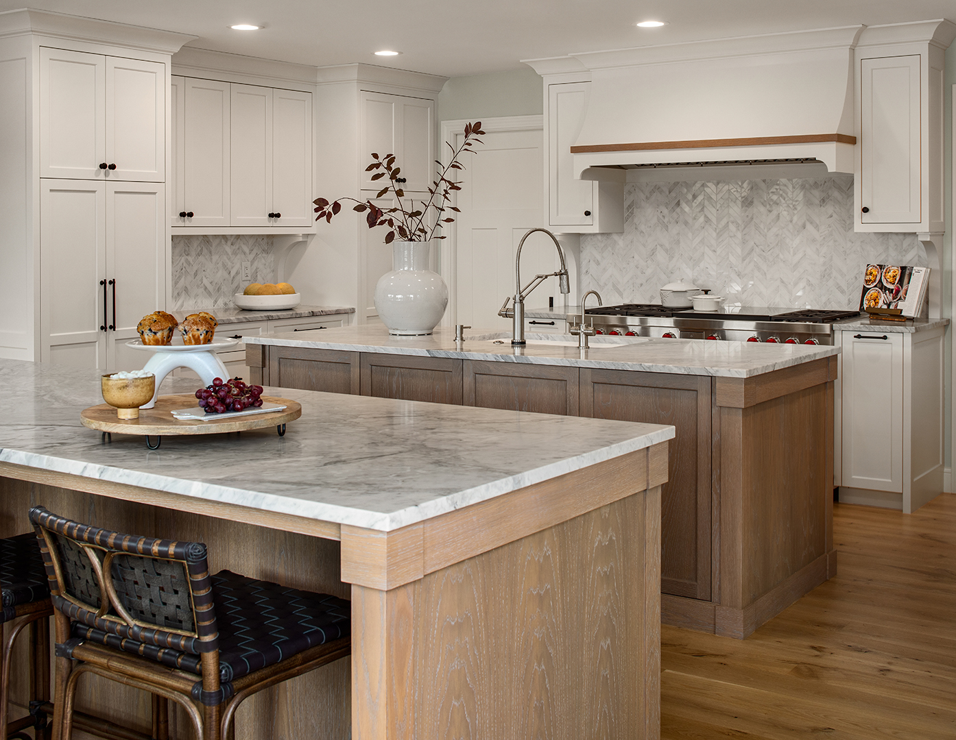 Two symmetrical, stained white oak islands, each with a lake view, add function and help organize the space. The inner island houses the sink and dishwasher, while the outer island has stools and undercounter beverage refrigerator drawers for entertaining. The arrangement allows for easy flow within the kitchen as well as between the kitchen and the main floor. Honed Italian Carrara marble countertops throughout, a stone that will patina over time, are a centerpiece. “Nothing popped the way the marble did,” Caitlin says. “I’m really happy with them, though Jack might disagree, as they definitely show wear and tear more easily.”